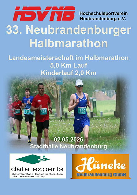 Im Rahmen des 33. Lauf im Kulturpark am 02.05.2026 veranstaltet der HSV Neubrandenburg die Landesmeisterschaft im Halbmarathon. Wir rufen alle SportlerInnen aus der Region auf, sich an unserer traditionsreichen Laufveranstaltung zu beteiligen. Wir bieten allen Lauf-Enthusiasten die Möglichkeit, sich auf unseren Strecken zu beweisen. Neben dem Kinderlauf über 2 Km, haben wir auch wieder den 5-Km-Lauf im Angebot.